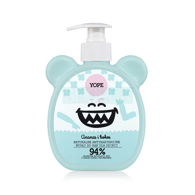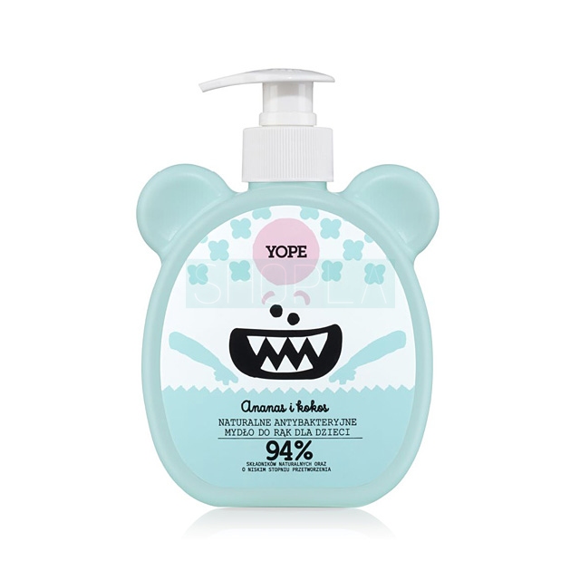 Yope Ananas i kokos to naturalne, antybakteryjne mydło do rąk dla dzieci. Usuwa ze skóry bakterie i inne zanieczyszczenia. Nie powoduje podrażnień, gdyż aż w 94% składa się z delikatnych substancji pochodzenia naturalnego i o niskim stopniu przetworzenia. Zamknięte jest w oryginalnej butelce zachęcającej do mycia rąk.