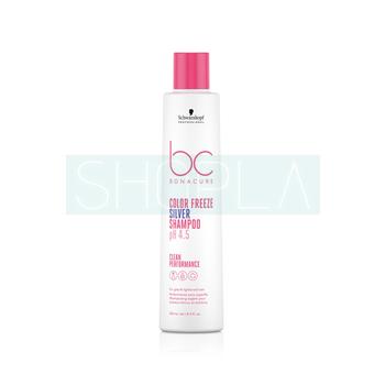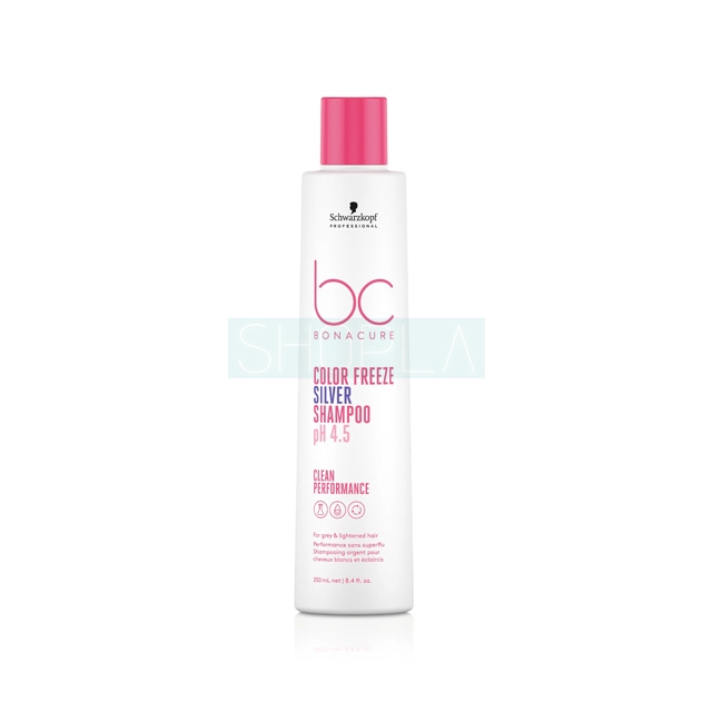 Schwarzkopf BC Color Freeze Silver to profesjonalny szampon przeznaczony do pielęgnacji włosów siwych i rozjaśnianych. Kosmetyk nie tylko skutecznie oczyszcza skórę głowy i pasma z wszelkich zanieczyszczeń, ale także kompleksowo uszczelnia powierzchnię włosów, chroniąc w ten sposób zawarte w nich pigmenty. Dzięki niemu kolor włosów zostaje podkreślony, a włosy nabierają miękkości i blasku. Zawarty w szamponie Schwarzkopf BC Color Freeze Silver fioletowy pigment skutecznie zapobiega żółtym tonom i pomaga utrzymać pożądaną tonację.