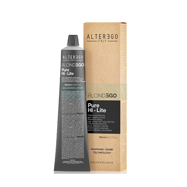 Alter Ego BlondEgo Pure Hi-Lite to rozjaśniacz w kremie do włosów. Umożliwia zmianę dotychczasowego odcienia do 3 poziomów, bez modyfikacji tonu. Preparat bardzo dobrze łączy się z oksydantem. Wspólnie tworzą jednolitą, gęstą mieszankę, która łatwo rozprowadza się na włosach i bardzo mocno do nich przylega.