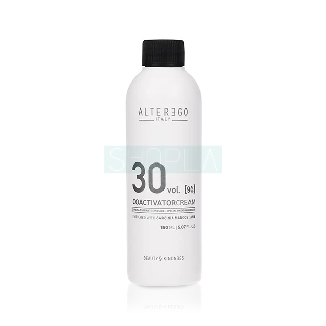 Oksydant Alter Ego Coactivator Cream 9% posiada gęstą, kremową konsystencję, łatwo łączy się z farbą i rozjaśniaczem. Powstała mieszanka pozwala uzyskać jednolity, nasycony i pełny blasku kolor. Praca z oksydantem Alter Ego Coactivator Cream 9% jest przyjemna i komfortowa. Preparat zawiera substancje, które dbają o dobrą kondycję włosów.