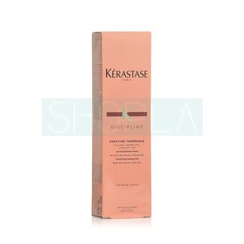 KERASTASE Discipline Keratine Thermique to innowacyjne keratynowe mleczko wygładzające, przeznaczone do codziennej pielęgnacji włosów uszkodzonych zabiegami chemicznymi i termicznymi. Formuła mleczka została wzbogacona ksylozą, która słynie ze swoich właściwości chroniących przed wysokimi temperaturami oraz polimerem, który tworzy na powierzchni włosów hydrofobową powłokę chroniącą pasma przed puszeniem i elektryzowaniem się.