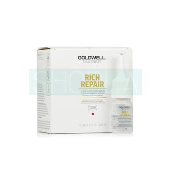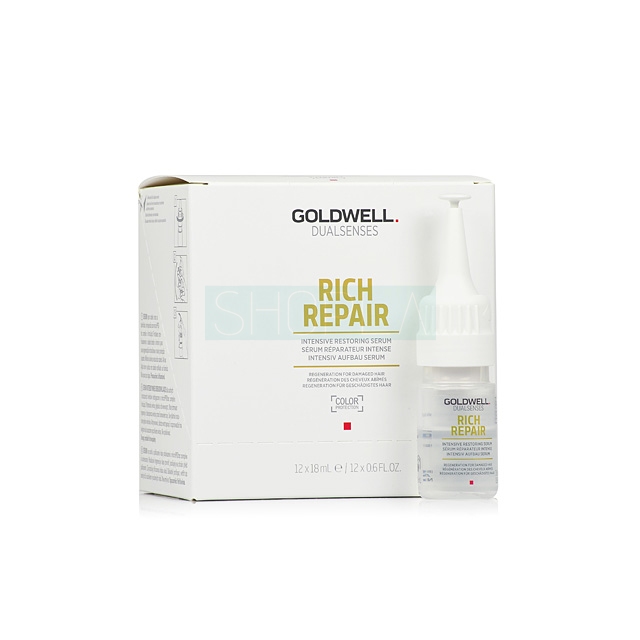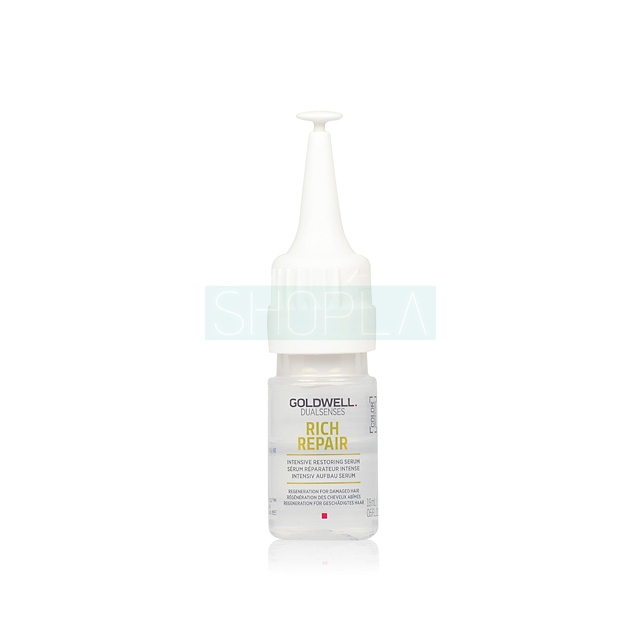 Goldwell Dualsenses Rich Repair Serum, to profesjonalna kuracja do włosów suchych i zniszczonych, zamknięta w poręcznych ampułkach. Obecność protein pashminu i jedwabiu gwarantują szybkie i widoczne efekty terapii. Aktywne składniki wnikając w głąb włosa odżywiają go i regenerują uszkodzenia oraz chronią przed powstawaniem kolejnych. Goldwell Dualsenses Rich Repair Serum ma działanie termoochronne, dzięki temu możemy być pewni, że suszarka czy prostownica, nie zrobią dodatkowej krzywdy naszym włosom. Dzięki kuracji z Goldwell Dualsenses Rich Repair Serum nasze pasma będą wygładzone, miękkie i pełne blasku.