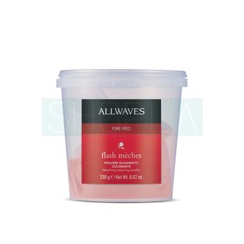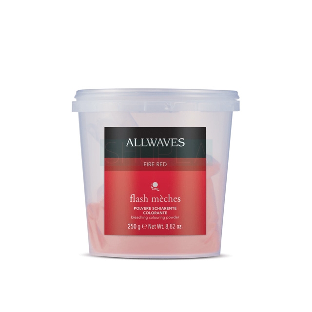 Allwaves Flash Meches Fire Red to innowacja w koloryzacji. Produkt charakteryzuje się podwójnym działaniem. Rozjaśnia włosy i jednocześnie nadaje im oryginalny, nasycony, czerwony kolor. Preparat może być stosowany w przypadku naturalnych i farbowanych włosów. W gamie Allwaves Flash Meches znajdują się jeszcze 2 odcienie, wszystkie można dowolnie łączyć, co daje możliwość nieograniczonej zabawy kolorem.