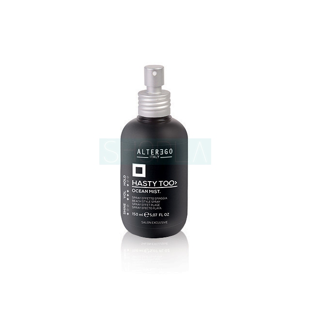 Alter Ego Hasty Too Ocean Mist to spray do stylizacji włosów. Charakteryzuje się silnymi właściwościami teksturyzującymi. Z jego pomocą stworzysz efekt lekkich, naturalnych, plażowych fal. Spray dodaje włosom objętości i delikatnie utrwala fryzurę. Formuła produktu wzbogacona została solą morską oraz ekstraktem z alg hawajskich.
