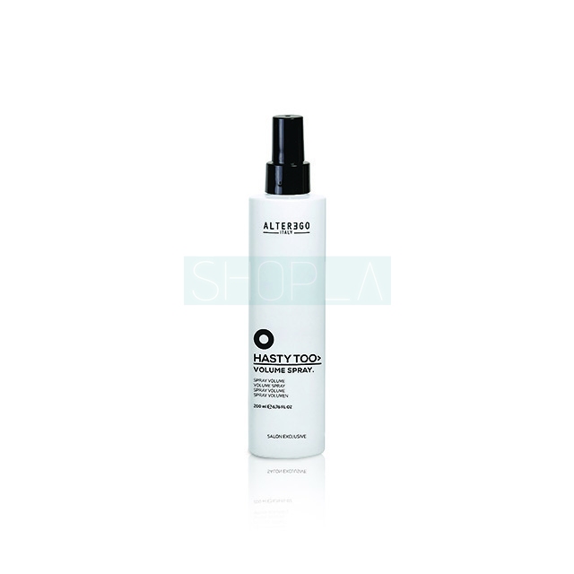 Alter Ego Hasty Too Volume Spray to spray dodający włosom objętości. Dedykowany jest osobom, posiadającym włosy cienkie, osłabione i zniszczone. Odbija płaskie pasma od nasady i znacznie zwiększa objętość włosów na całej długości. Alter Ego Hasty Too Volume Spray pozostawia włosy jedwabiście gładkie i miękkie w dotyku. Znacznie ułatwia rozczesywanie pasm.