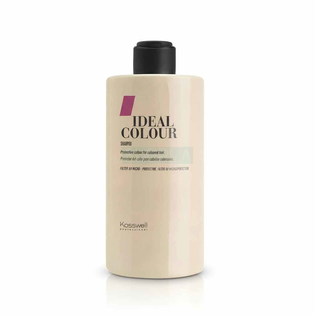 Kosswell Ideal Color Shampoo - odżywczy szampon do włosów farbowanych. Delikatne składniki myjące skutecznie oczyszczają skórę głowy nie wypłukując z włosów pigmentu. Ponadto lekka formuła nie obciąża włosów, dzięki czemu może być stosowany codziennie. Dodaje także miękkości i maksymalnego połysku. Aktywne składniki zapobiegają tworzeniu się wolnych rodników gwarantując jednocześnie odżywienie i domknięcie łuski włosa. Dodatkowo zawiera filtr słoneczny dla ochrony włosów przed promieniem UV.
