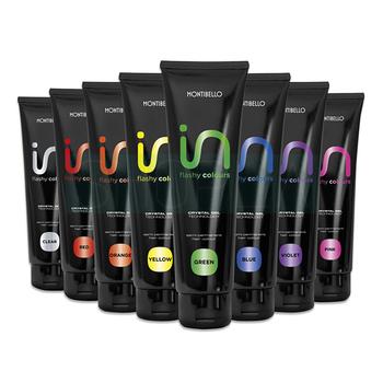 Montibello InFlashy to innowacyjna linia żelowych farb do włosów bez amoniaku, nadtlenków i barwników oksydacyjnych. To pierwszy autorski wymiar koloryzacji oparty na bezpośrednich barwnikach, oferujący niezwykłą paletę kolorów o intensywnej tonacji. Linia ta składa się z siedmiu soczystych i intensywnych tonów: czerwony, pomarańczowy, żółty, zielony, niebieski, fioletowy i różowy, oraz dodatkowego tonu CLEAR, który pozwala na definiowanie koloru i stopniowanie jego intensywności.