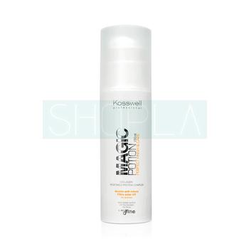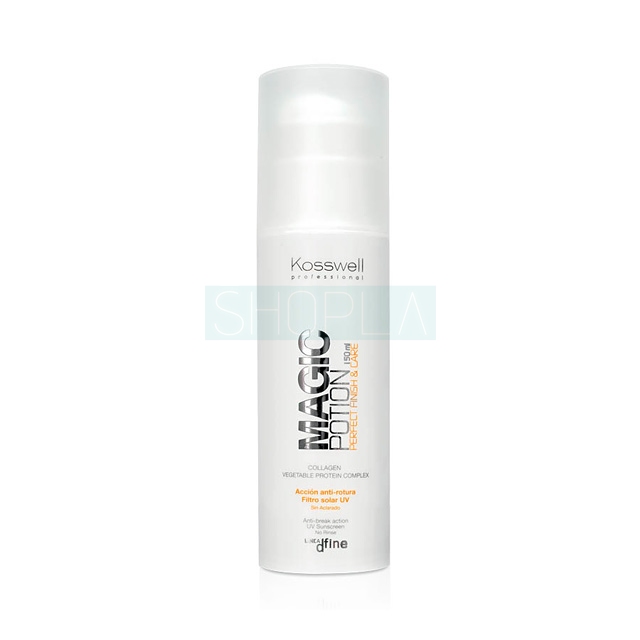 Kosswell Magic Potion Perfect Finish & Care - pielęgnujący, lekki krem do włosów dodający tekstury. Głęboko odżywia i nawilża włosy poprawiając ich wygląd już od pierwszego użycia. Krem nałożony przed suszeniem i stylizacją pozwala uzyskać pożądaną teksturę, utrwalenie i maksimum objętości. Także nawet cienkie, puszące się włosy zostaną pogrubione i uniesione na całej długości. Ponieważ lekka, kremowa konsystencja nie obciąża włosów i nadaje im naturalnego wyglądu. Specjalnie opracowana formuła zawiera kolagen oraz wielofunkcyjny kompleks białek roślinnych o właściwościach nadającym włosom sprężystości i ułatwiających modelowanie. Ponadto krem do włosów Kosswell wzbogacono w aktywne składniki zapobiegające uszkodzeniom i łamaniu się włosów. Systematyczne użytkowanie przy każdym modelowaniu sprawia, że włosy stają się bardziej elastyczne, mocniejsze i łatwe w rozczesywaniu. Zawiera także ochronę termiczną z filtrem przeciwsłonecznym UV. Utrwala fryzurę na poziomie 2.