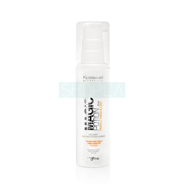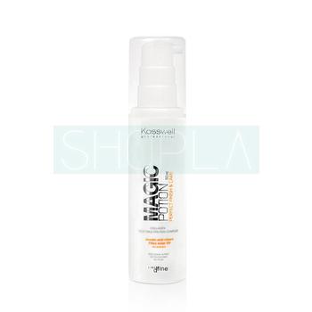 Kosswell Magic Potion Perfect Finish & Care - pielęgnujący, lekki krem do włosów dodający tekstury. Głęboko odżywia i nawilża włosy poprawiając ich wygląd już od pierwszego użycia. Krem nałożony przed suszeniem i stylizacją pozwala uzyskać pożądaną teksturę, utrwalenie i maksimum objętości. Także nawet cienkie, puszące się włosy zostaną pogrubione i uniesione na całej długości. Ponieważ lekka, kremowa konsystencja nie obciąża włosów i nadaje im naturalnego wyglądu. Specjalnie opracowana formuła zawiera kolagen oraz wielofunkcyjny kompleks białek roślinnych o właściwościach nadającym włosom sprężystości i ułatwiających modelowanie. Ponadto krem do włosów Kosswell wzbogacono w aktywne składniki zapobiegające uszkodzeniom i łamaniu się włosów. Systematyczne użytkowanie przy każdym modelowaniu sprawia, że włosy stają się bardziej elastyczne, mocniejsze i łatwe w rozczesywaniu. Zawiera także ochronę termiczną z filtrem przeciwsłonecznym UV. Utrwala fryzurę na poziomie 2.