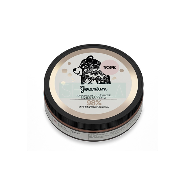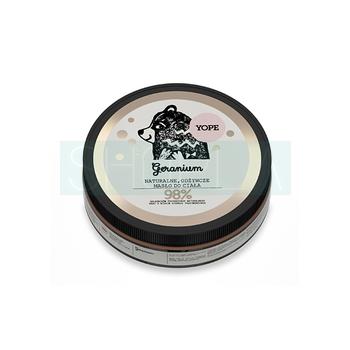 Yope Geranium to masło do ciała, przeznaczone do pielęgnacji każdego rodzaju skóry. Oparte jest na substancjach naturalnych, takich jak: oliwa z oliwek, masło shea, olej kokosowy czy olej z awokado. Po jego zastosowaniu skóra jest jedwabiście gładka, miękka w dotyku i odporna na działanie czynników zewnętrznych.