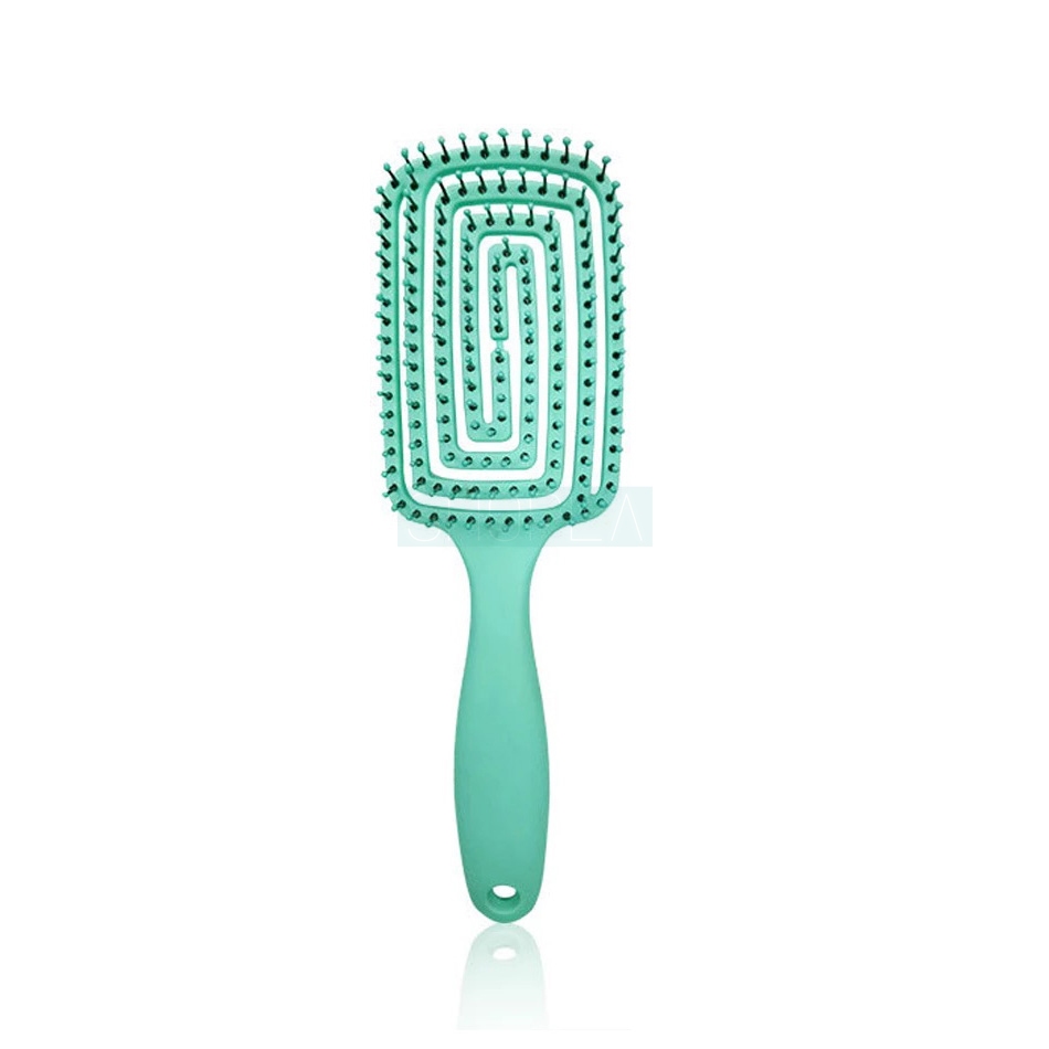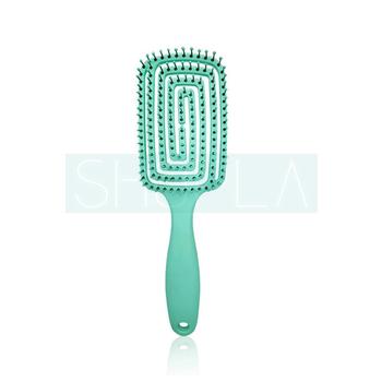 Płaska szczotka do włosów z łatwością rozczesuje nawet mocno poplątane pasma. Ma elastyczny korpus, który dopasowuje się do kształtu głowy, dzięki czemu kolce docierają do wszystkich partii włosów. Owalne zakończenia kolców, zapewniają skórze głowy bezpieczeństwo. Szczotka sprawdzi się w rozczesywaniu suchych i mokrych włosów. Może okazać się przydatna także podczas aplikacji odżywek i masek.
