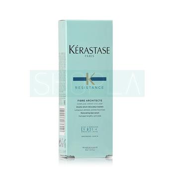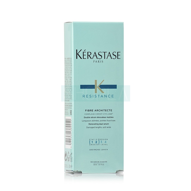 KERASTASE Resistance Fibre Architecte Serum to podwójne serum przeznaczone do intensywnej regeneracji rozdwojonych końcówek. Produkt wzbogacono o Complexe Ciment-Cylane z Pro-keratyną (która uzupełnia uszkodzenia i ubytki powstałe na ich powierzchni), ceramidami (które wzmacniają przestrzeń między łuskami włosa wypełniając uszkodzenia w cemencie międzykomórkowym) oraz składnikiem Intra-Cylane (wzmacniającym osłabioną strukturę włosów).