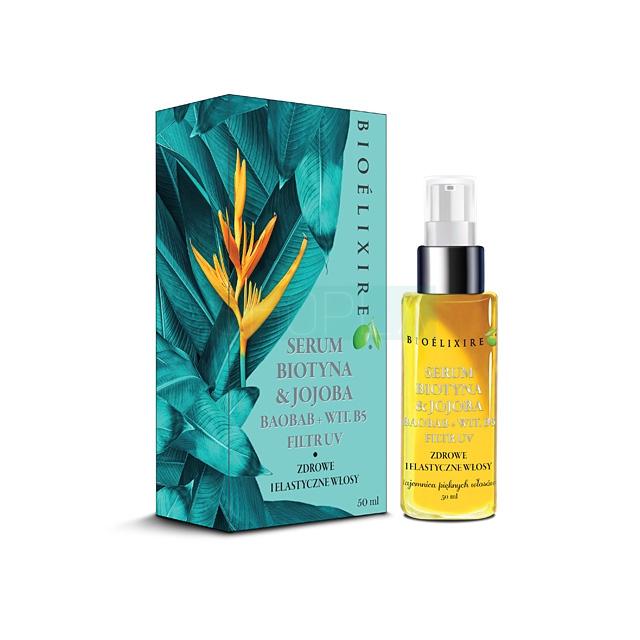 Serum z biotyną i olejem jojoba Bioelixire przeznaczone jest do pielęgnacji włosów osłabionych i kruchych. Jego receptura oparta jest na substancjach, które uelastyczniają włókna włosów, tym samym zmniejszają ich łamliwość i uodparniają je na szkodliwe działanie czynników zewnętrznych. Co więcej, biotyna hamuje proces nadmiernego wypadania włosów i pobudza cebulki do wzrostu. Serum Bioelixire pozostawia pasma jedwabiście gładkie, lśniące i miękkie w dotyku.