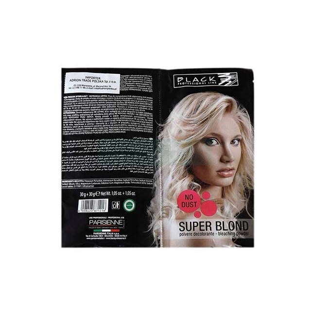 Black Super Blond to profesjonalny rozjaśniacz do włosów, który pozwala na zamianę dotychczasowego koloru nawet o 6 tonów. Ma bezpyłową formułę co znacznie wpływa na polepszenie komfortu pracy. Po połączeniu z oksydantem, łatwo rozprowadza się na pasmach i mocno do nich przylega. Black Super Blond świetnie sprawdzi się w celu rozjaśnienia całości włosów lub ich poszczególnych partii.