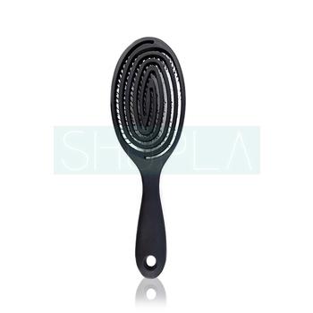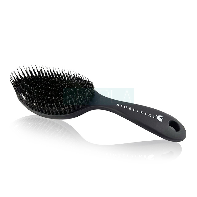 Szczotka Bioelixire posiada mieszane włosie – plastikowe, owalnie zakończone igiełki oraz naturalną szczecinę dzika. Elastyczna główka dopasowuje się do kształtu głowy, co zwiększa skuteczność i komfort rozczesywania. Szczotka Bioelixire z łatwością, i co istotne – bez bólu, rozczesuje nawet wyjątkowo mocno poplątane pasma. Pozostawia je jedwabiście gładkie i zapobiega ich puszeniu się.