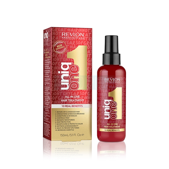 REVLON Uniq One to odżywcza kuracja przynosząca włosom 10 korzyści. Kosmetyk świetnie sprawdza się w codziennej pielęgnacji pasm farbowanych, matowych i osłabionych. Dzięki zastosowaniu nowoczesnych technologii możliwa staje się kompleksowa pielęgnacja włosów oraz zapewnienie im ochrony przed szkodliwymi czynnikami zewnętrznymi, takimi jak gorąca temperatura, czy promieniowanie UVA/UVB.