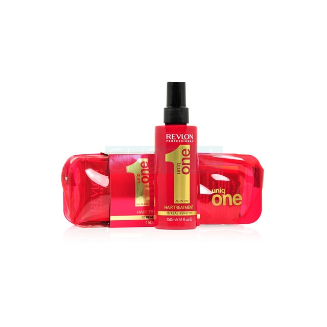 Revlon Uniq One to zestaw złożony z kuracji w sprayu do każdego rodzaju włosów oraz pojemnej kosmetyczki. Produkt ten charakteryzuje się wszechstronnym działaniem. Przynosi kosmykom aż 10 korzyści, między innymi: nawilża je, odżywia, eliminuje problem rozdwajających się końcówek, dodaje pasmom objętości, zapewnia im termoochronę i chroni przed promieniowaniem ultrafioletowym. Efekty działania kuracji Revlon Uniq One widoczne są już po kilku zastosowaniach.