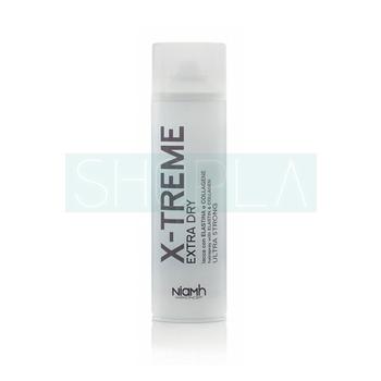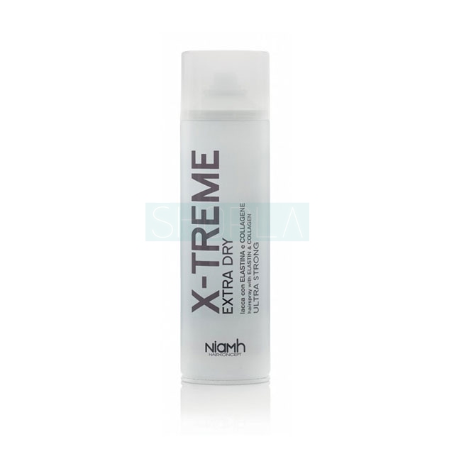 Lakier Niamh X-Treme Extra Dry doskonale sprawdzi się podczas stylizacji każdego rodzaju włosów. Z łatwścią utrwala nawet skomplikowane fryzury. Charakteryzuje się bardzo mocnym i trwałym działaniem. Fryzura godzinami pozostaje niezmienna, nawet pomimo niesprzyjających warunków. Lakier Niamh X-Treme Extra Dry wzbogacony jest kolagenem i elastyną. Substancje te mają pozytywny wpływ na kondycję włosów.